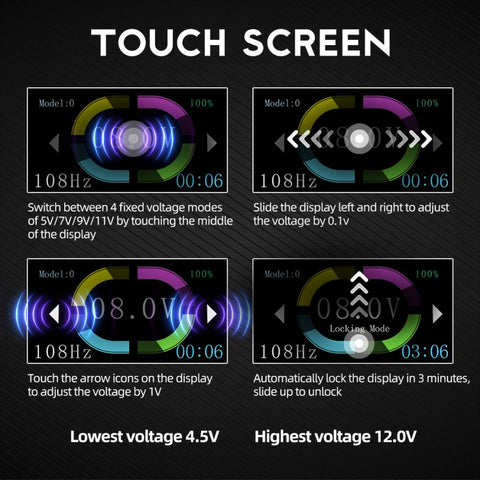 - Adjust output voltage:3 voltage modes: fixed voltage(4 memory modes corresponding to5V/7V/9V/11V Touch the middle of thedisplay to switch modes), increase/decrease by 0.1V(Slide the display left and right to adjustthe voltage by 0.1v), and increase/decrease by 1V(Touch the red arrow icons on the displayto adjust the voltage by 1V).